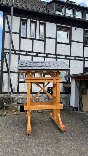In het dorp woont iemand die alles kan maken van hout. Ik had hem deze foto gestuurd en gevraagd of hij zoiets zou kunnen maken. Groot was de verbazing dat het ding drie weken later op de stoep werd gezet. Wat snel en wat een enorm geval.