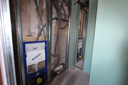 Dit voorjaar zijn we er eindelijk mee aan de slag gegaan. Alles moest gebeuren. Een nieuwe vloer voor de badkamers, de muren, elektra, afvoer, waterleiding, verwarming, plafond, enzovoort, enzovoort.